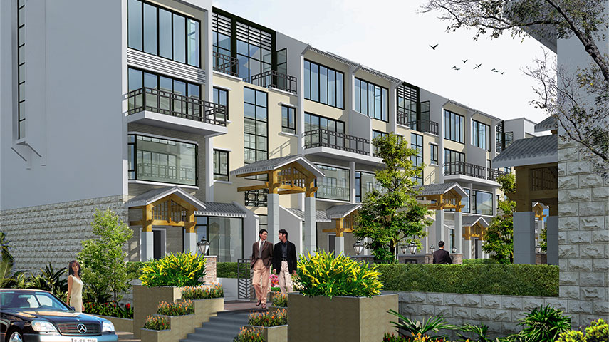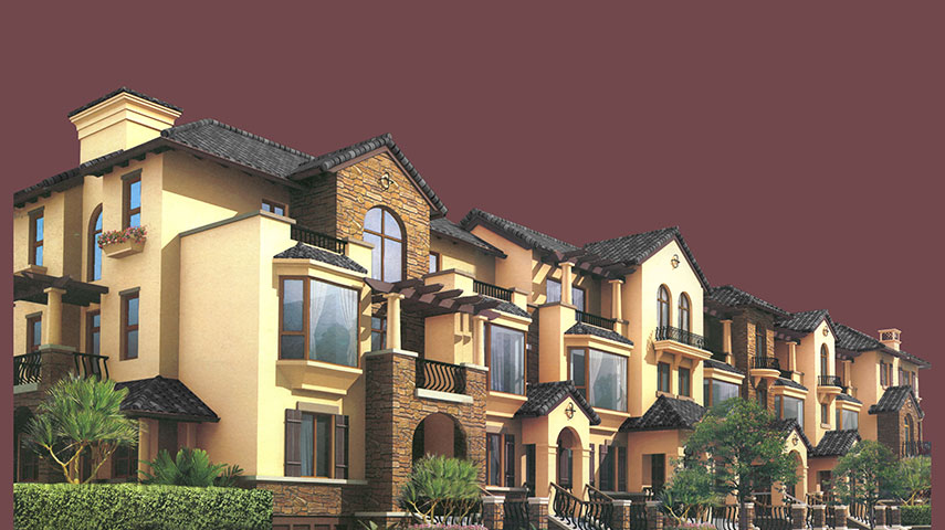 “嘉龙花园”项目在小区中心水景处匠心独韵的规划了四栋单体Villa,坐落在由水景庭院、木制小品、喷泉雕塑、鹅卵石小径、各类名贵植物围合而成的自然环境之中,设计时追求更加自由舒适的空间关系,不对称设计、外廊设计、亲水绿廊、前庭后院,强调自然景观、空气阳光、运动流水。规划设计为新古典主义(Neoclassical)建筑风格,外观装饰豪华,立面为一排双层柱廊,气度尊贵;墙面、窗户、窗顶、屋檐等处均有精美的雕花装饰,尽显豪华气派;冬日处两根厚实的古典圆柱所支撑的高挑门廊,启示着主人卓尔不凡的身价和豁达宽广的心胸。材质和色彩选用浅灰色毛面花岗石为基座,英红色、白色高档外墙涂料为墙身,屋顶则是作为别墅专用的铁灰色饰面瓦,整栋别墅流露出着自然而高贵的色彩。
